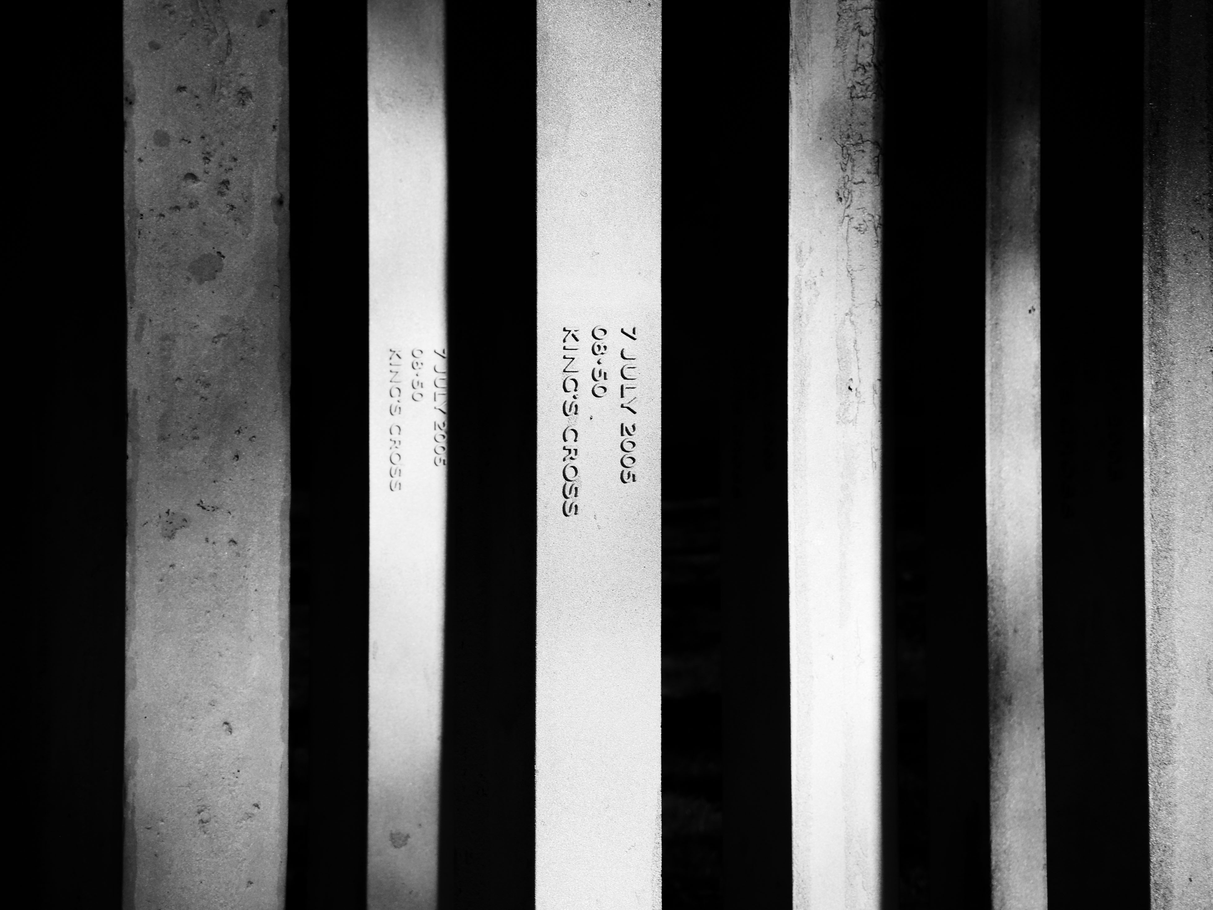 A stainless steel plaque listing the names of the victims is sited on a grass bank at the far eastern end of the memorial-19 June 25, 2014 London Photo Routes Leave a comment 7/7 London Bombing Memorial -Hyde park Detail